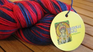 Another indy dyer named Jennifer Thompson who owns Theodora’s Pearls was setting up her trunk show at The Knitting Fairy as I arrived, and everyone was drooling over her lovely yarns! Her yarn tags are pretty sweet, too!